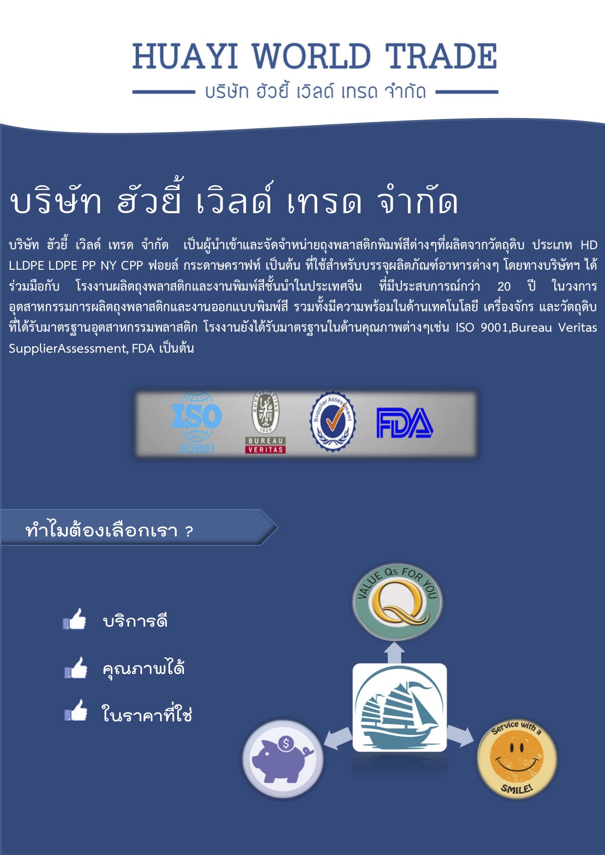 เป็นผู้นำเข้าและจัดจำหน่ายถุงพลาสติกพิมพ์สีต่างๆที่ผลิตจากวัตถุดิบ ประเภท HD LLDPE LDPE PP NY CPP ฟอยล์ กระดาษคราฟท์ เป็นต้น ที่ใช้สำหรับบรรจุผลิตภัณฑ์อาหารต่างๆ โดยทางบริษัทฯ ได้ร่วมมือกับ โรงงานผลิตถุงพลาสติกและงานพิมพ์สีชั้นนำในประเทศจีน ที่มีประสบการณ์กว่า 20 ปี ในวงการอุตสาหกรรมการผลิตถุงพลาสติกและงานออกแบบพิมพ์สี รวมทั้งมีความพร้อมในด้านเทคโนโลยี เครื่องจักร และวัตถุดิบที่ได้รับมาตรฐานอุตสาหกรรมพลาสติก โรงงานยังได้รับมาตรฐานในด้านคุณภาพต่างๆเช่น ISO 9001,Bureau Veritas SupplierAssessment, FDA เป็นต้น